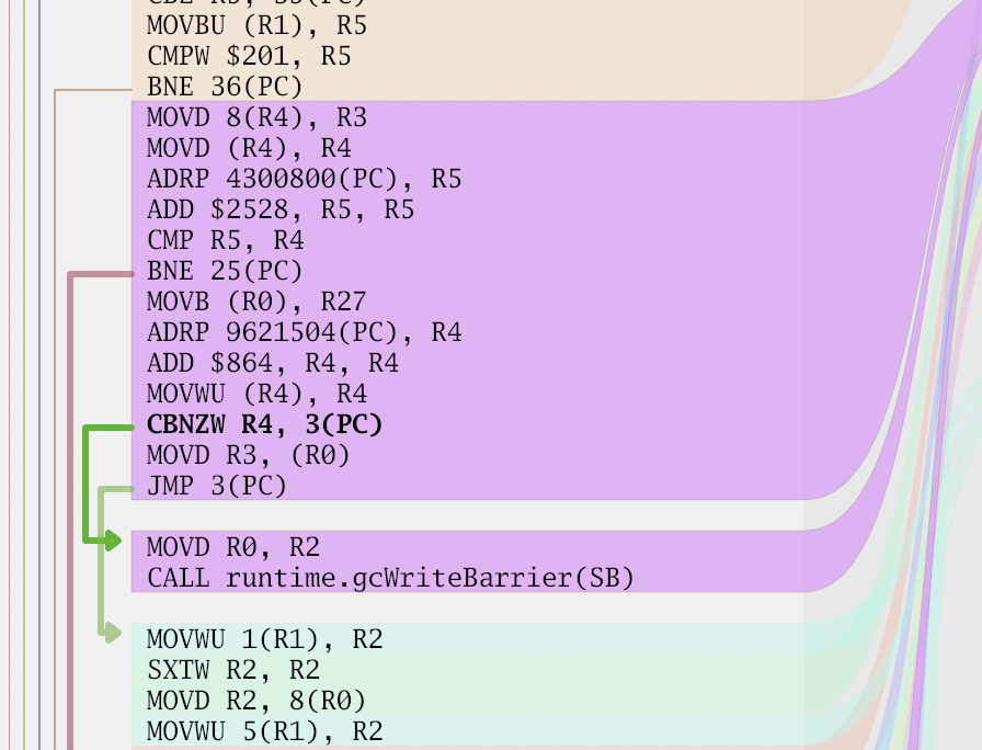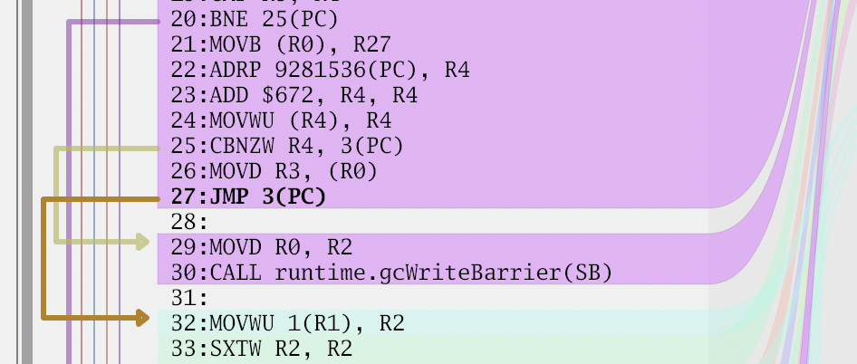 The next thing I wanted to visualize was drawing jumps in the code. They are important from a performance perspective. It's relatively common for disassemblers to draw an arrow from the jump location to the destination. This brings up two problems, detecting the jumps, and figuring out how to draw the lines.